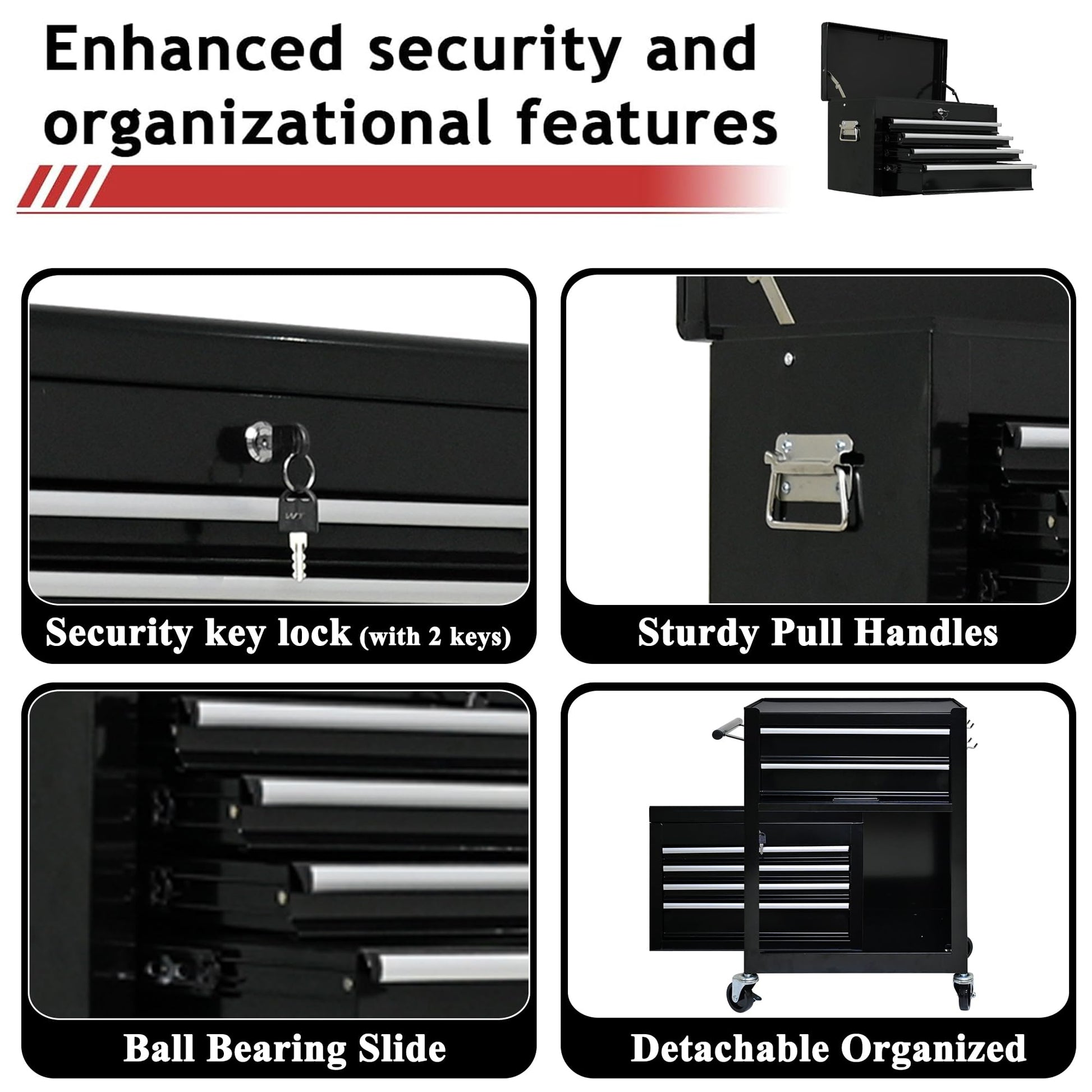 - 【Stable & Durable】 Tool chest is made of premium heavy-duty cold-rolled steel with powder coating, stable construction, avoids from scratching, denting, and chipping, more durable; classic color. The tool chest with drawers is detachable, can be divided into top tool box and bottom tool cart, with an independent locking system. The overall bearing capacity of the tool cabinet is 220lbs. The bearing capacity of drawers is 33lbs.